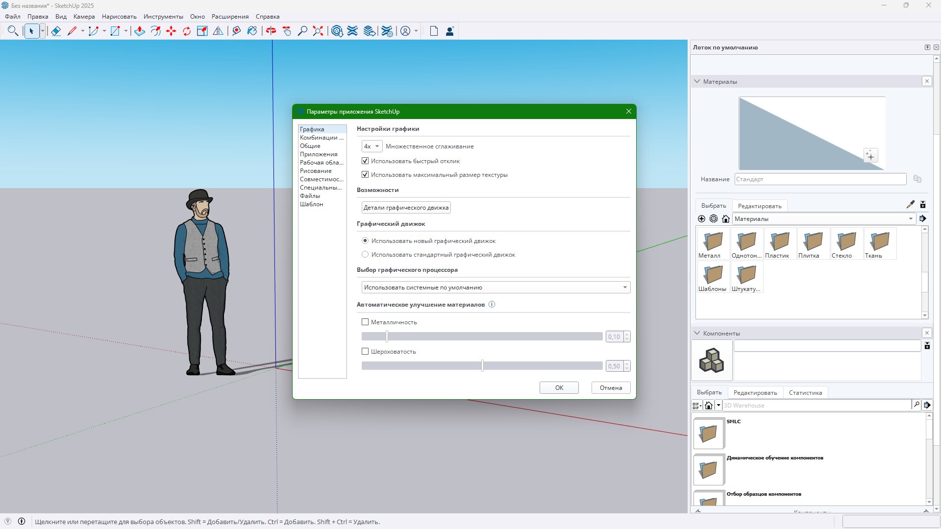 Используя SketchUp, вы можете выполнять следующие действия: Рисовать, изменять, измерять, вращать, масштабировать и перемещать геометрические фигуры. Использовать точные размеры и указывать их при помощи текста. Устанавливать плоскости сечения для просмотра и работы внутри моделей. Использовать в моделях заготовленные текстуры, такие как кирпич, дерево, черепица, стекло, либо создавать новые текстуры. Добавлять заготовленные компоненты, например деревья, автомобили, двери и окна, а также людей, либо создавать новые компоненты. Сглаживать поверхности. Моделировать тени в реальном времени для любого участка на Земле. Имитировать расположение камеры в пространстве. Создавать проходы. Создавать презентации. Использовать органическое моделирование (с помощью Песочницы). Импортировать 2D-изображения в следующих форматах: Изображение JPEG (.jpg) Portable Network Graphics (.png) Tagged Image File (.tif) Targa File (*.tga) Рисунок Windows (.bmp) Импортировать следующие 3D-модели и информацию. SketchUp (.skp). Рельеф Google Планета Земля. Примечание. Предусмотрена возможность получения текущего изображения (черно-белый снимок) местности, которая отображается в Google Планета Земля при помощи кнопки Получить текущий вид. Импортируются две версии изображений местности: 2D и 3D, при этом можно переключаться между ними с помощью кнопки Переключить местность. Изображения местности используются только для ссылок и не включаются в модель при ее расположении в Google Планета Земля. Изображение включает в себя ссылки на широту и долготу модели в Google Планета Земля, поэтому они могут быть также использованы для изучения теней. Программа Google Планета Земля не экспортирует собственные 3D-модели зданий (здания, которые отображаются при выборе слоя Здания в Google Планета Земля). Эта информация защищена и не может распространяться без разрешения правообладателя, следовательно, импортирование таких зданий в SketchUp не предусмотрено. 3DS (.3ds). Примечание. Для создания импортируемого 3DS-файла с текстурами необходимо сохранить файлы текстур в той же папке, в которой будет создан сам 3DS-файл. DEM (.dem, .ddf) Экспортирование 2D-изображений моделей. Изображение JPEG (.jpg) Portable Network Graphics (.png) Tagged Image File (.tif) Рисунок Windows (.bmp). Экспорт анимации и проходов в MOV- или AVI-файлы. Размещение моделей в Google Планета Земля. Размещение моделей SketchUp в Google Планета Земля выполняется при помощи команды Разместить модель. SketchUp автоматически определит используемую версию Google Планета Земля (3 или 4) и создаст соответствующий KMZ-файл. (Новые версии SketchUp и Google Планета Земля в настоящее время поддерживают отображение текстур и изображений в Google Планета Земля.) Экспортирование файла Google Планета Земля непосредственно в KMZ-формат (Google Планета Земля 3 или 4). Файлы Google Планета Земля 3 могут просматриваться в обеих версиях Google Планета Земля, но текстуры отображаются только в Google Планета Земля 4. Файлы Google Планета Земля 4 в Google Планета Земля 3 отображаться не будут. Обмен моделями в службе 3D-моделей. При отправке моделей, размещенных в Google Планета Земля, будут созданы файлы SketchUp (.skp) и Google Планета Земля 3 (.kmz). Если установлена новая версия SketchUp, то при отправке будет также создан файл Google Планета Земля 4 (.kmz). Предусмотрена печать части модели, отображаемой в области рисования программы SketchUp. Печатайте и экспортируйте растровые изображения с выбранным разрешением. Создавайте до