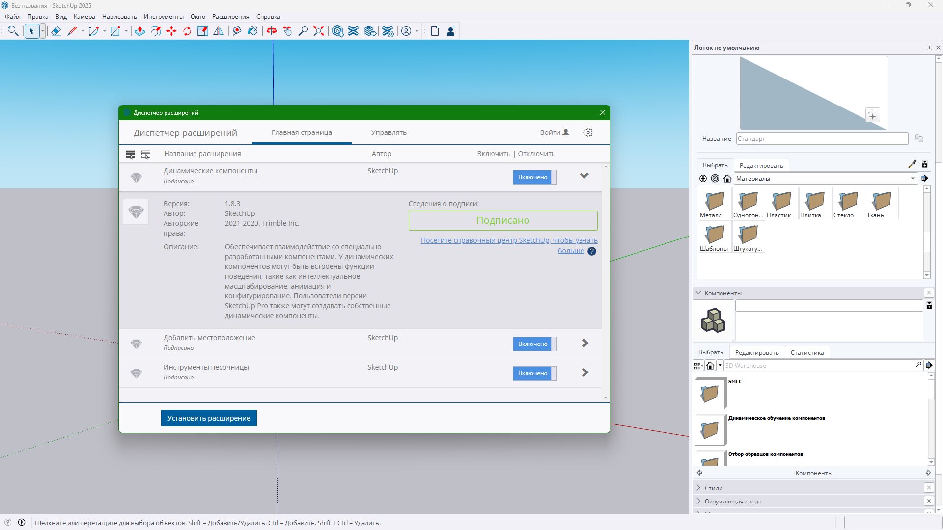 SketchUp Pro 2025 25.0.660 RePack by KpoJIuK Год выпуска: 2025 Версия: 2025 25.0.660 Адрес оф. сайта: Trimble Inc. Автор сборки: by KpoJIuK Язык интерфейса: Русский, Английский Лечение: не требуется (инсталлятор уже пролечен) Системные требования: ОС: Windows 10 (x64) 11 (x64) Рекомендуемые требования: 2+ GHz процессор 8+ GB RAM оперативной памяти 700 MB свободного пространства на жестком диске Видеокарта 3D-класса с 1 ГБ памяти или выше и поддержкой аппаратного ускорения. Пожалуйста, убедитесь, что драйвер видеокарты поддерживает OpenGL 3.1 или выше и обновлен. NET Framework версии 4.5.2. -Описание: SketchUP Pro - является профессиональной версией приложения, позволяющего создавать 3D-модели, демонстрировать их в качестве презентации, обмениваться ими. Программа будет полезна везде, где есть необходимость применения 3D-моделей, будь-то проектирование пристройки для дома, обучение школьников геометрии или же создание модели для Google Earth. Множество простых инструментов и задействование интеллектуальной системы рисования позволяют легко создавать и редактировать модели, экспортировать их, создать видеофильм или распечатать результаты работы. Вместо введения значений координат можно использовать многофункциональную систему управления местоположением объекта с помощью меток, текстовых подсказок, линий различных цветов. Пользование инструментами максимально приближено к реальной жизни, ведь так намного легче научиться и, главное, запомнить, как ими пользоваться.