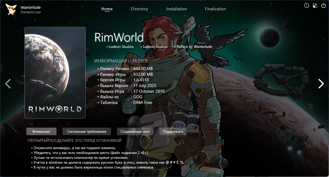 Год выпуска: 2018 Жанр: Strategy, real-time, manage, business, simulator Разработчик: Ludeon Studios Издатель: Ludeon Studios Платформа: PC Тип издания: Repack Версия: 1.6.4543 | от 6 августа 2025 г. Язык интерфейса: Русский, английский, французский, немецкий, польский, итальянский, испанский, чешский, датский, нидерландский, венгерский, японский, норвежский, португальский, португальский (бразильский), китайский (упрощенный), китайский (традиционный), шведский, турецкий, украинский, финский, корейский, румынский, каталанский, эстонский, греческий, словацкий, испанский (латиноамериканский) Язык озвучки: Отсутствует Лекарство: Не требуется (DRM-Free) Минимальные системные требования: > Операционная система: Windows 7 64-бит > Процессор: Core 2 Duo > Оперативная память: 4 ГБ > Видеокарта: HD Graphics 4000, Shader 4.0 > Место на диске: 1 ГБ Описание: Научно-фантастический симулятор колонии под управлением ИИ-рассказчика. RimWorld управляет тремя людьми, выжившими после крушения космического лайнера, в строительстве колонии в приграничном мире на краю изученного пространства. Источники вдохновения этой игры -это дух космического вестерна Firefly, глубокая проработка Dwarf Fortress и эпические Dune и Warhammer 40 000. Следите за настроением, потребностями, мыслями, ранениями и болезнями колонистов. Участвуйте в глубоко проработанной боях небольших команд. Используйте одежду, оружие и экипировку из металла, дерева, камня, ткани и экзотических, футуристических материалов. Сражайтесь с пиратами-налетчиками, враждебными племенами, свирепыми животными и древними машинами убийств. Особенности игры:ИИ-рассказчик: RimWorld разработана не как состязательная стратегическая игра, а как генератор историй. Она не о победе и проигрыше, она о драме, трагедии и комедии, происходящей в вашей колонии. Игра создает такие события, как пиратские набеги, прибытие торговцев и бури. Но эти события не случайны. RimWorld использует ИИ-рассказчика (по образцу ИИ-директора из Left 4 Dead), который анализирует ситуацию и решает, какое событие по его мнению создаст лучшую историю. Можно выбирать между тремя рассказчиками: Продуманная Кассандра Классическая, более продуманная, ориентированная на строительство Фиби Тихоня и абсолютно непредсказуемый Ренди Случай.• Разношерстная команда: В RimWorld колонисты не являются профессиональными поселенцами - они те, кто выжил в катастрофе пассажирского лайнера. Они могут быть бухгалтерами, домохозяйками, журналистами, поварами, аристократами, беспризорниками, солдатами. Аристократ будет силен в навыках общения (для вербовки заключенных и торговых переговорах о ценах), но будет отказываться выполнять физическую работу. Простак с фермы знает, как выращивать еду, но не сможет заниматься исследовательской деятельностью. Занудный ученый будет силен в исследованиях, но будет абсолютно неспособен выполнять социальные задачи. • Моделирование здоровья: Ранения, инфекции, протезирования и хронические заболевания отслеживаются по каждой части тела и влияют на способности героев. Повреждения глаз осложняют возможность стрелять или делать хирургические операции. Ранение в ноги замедляют людей. Руки, мозг, рот, сердце, печень, почки, желудок, ноги, пальцы на руках и ногах и другие части тела могут получить ранения, заболеть или быть утерянными. Все это приводит к логичным внутриигровым эффектам. У каждой особи свое строение тела, Отнимите у оле