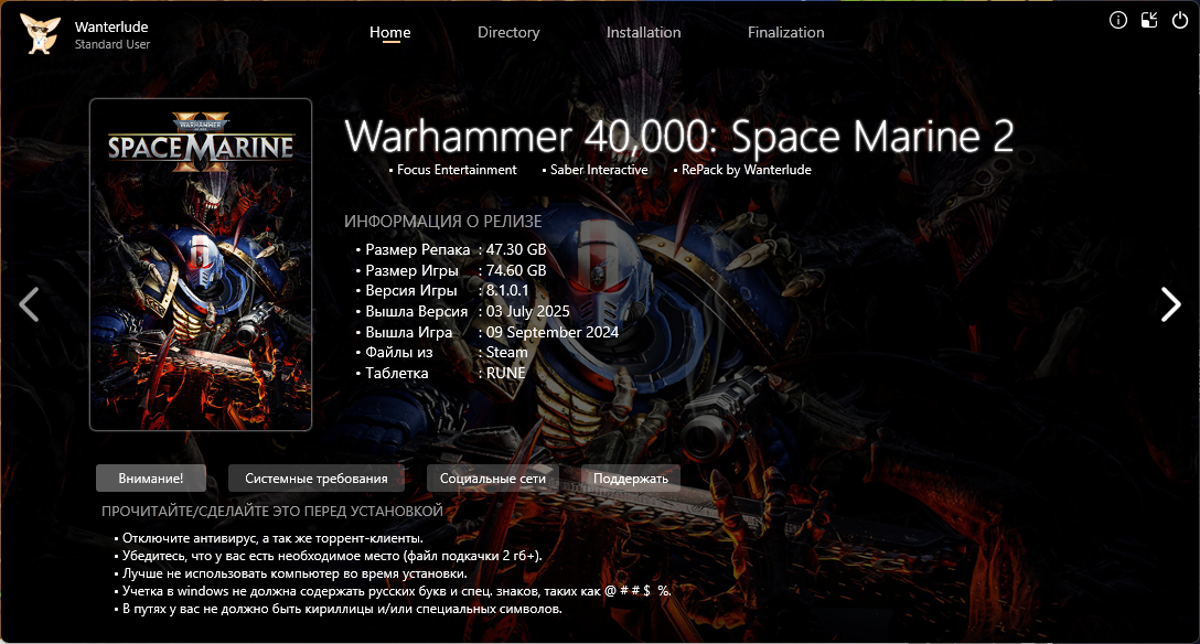 • Наличие кириллицы и спецсимволов в путях к архивам репака и устанавливаемой игре недопустимы.