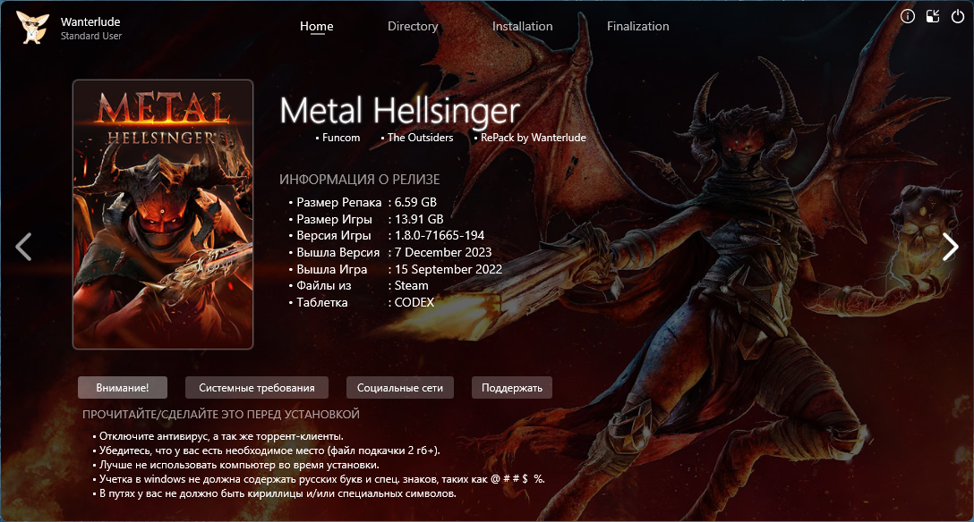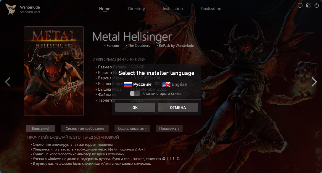 • Наличие кириллицы и спецсимволов в путях к архивам репака и устанавливаемой игре недопустимы.