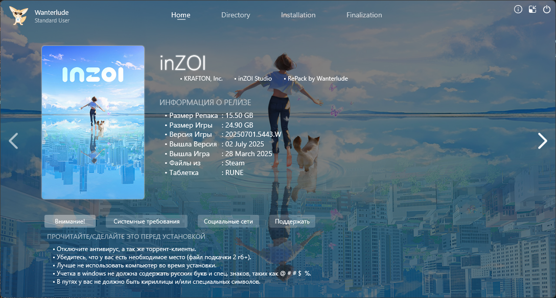 • Наличие кириллицы и спецсимволов в путях к архивам репака и устанавливаемой игре недопустимы.