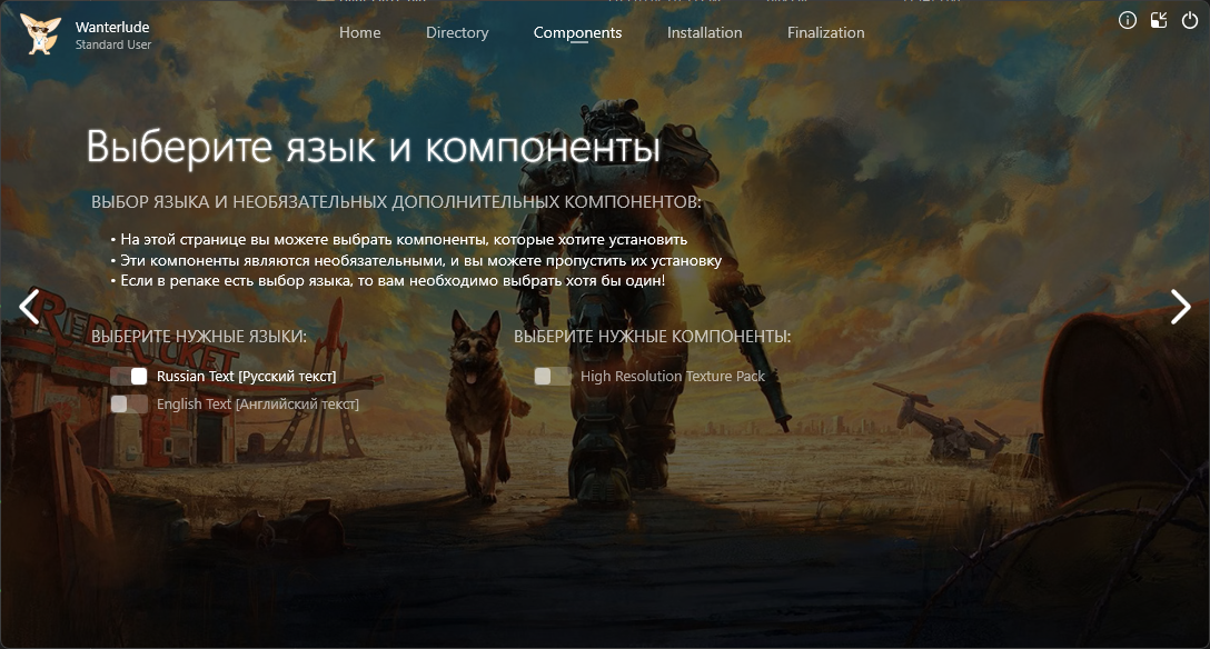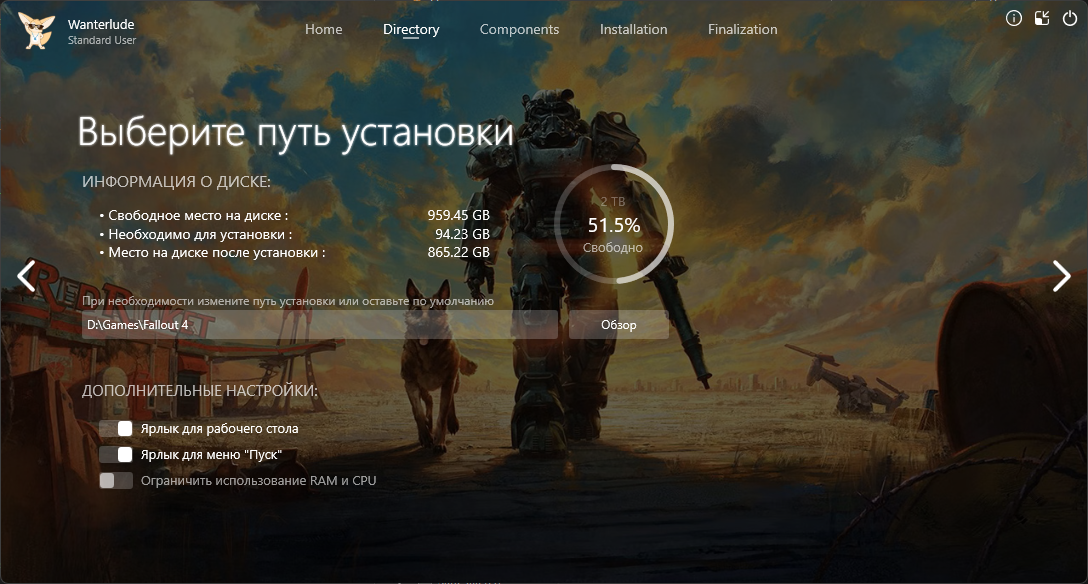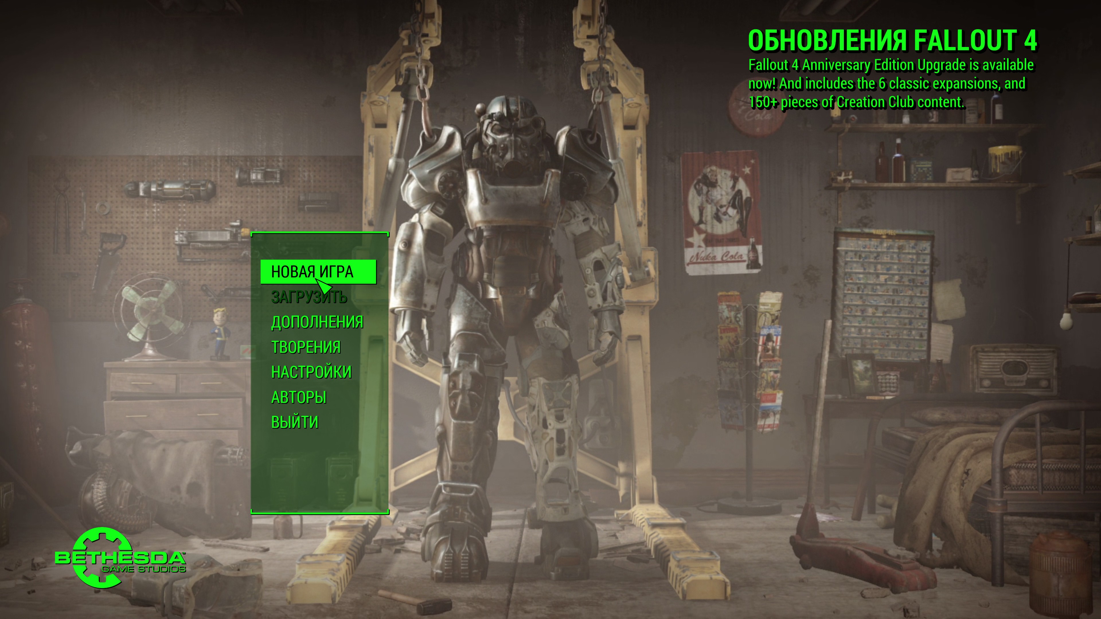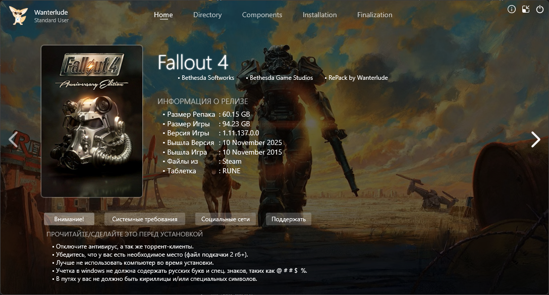 Год выпуска: 2015 Жанр: Action, RPG, 3D, 1st Person, 3rd Person Разработчик: Bethesda Game Studios Издатель: Bethesda Softworks LLC Платформа: PC Тип издания: Repack Версия: 1.11.137.0.0 | от 10 ноября 2025 г. Язык интерфейса: Русский*, английский Язык озвучки: Английский Лекарство: Вшито (RUNE) *Субтитры включаются в настройках игры (Видео) Минимальные системные требования: > Операционная система: Windows 7/8/10/11 64-бит > Процессор: Core i5-2300 2.8 ГГц / Phenom II X4 945 3.0 ГГц > Оперативная память: 8 ГБ > Видеокарта: 2 ГБ, GeForce GTX 550 Ti / Radeon HD 7870, DirectX 11 > Место на диске: 36.8/95 ГБ Описание: Fallout 4 - это продолжение знаменитой постапокалиптической серии, события которой развиваются спустя несколько лет после окончания Fallout 3. Протагонистом игры становится единственный выживший из Убежища 111, которое находилось неподалеку от Бостона. Волей судьбы главному герою предстоит покинуть свой дом, чтобы пуститься в полное опасностей приключение, где на пути у него будут стоять мутанты, рейдеры, наемники и различные стихийные опасности. Четвертая часть серии отличается от своих предшественниц новым местом действия - Бостоном и его окрестностями - а так же некоторыми изменениями в игровой механике. Так, была переработана ролевая система S.P.E.C.I.A.L., протагонист научился модифицировать оружие, а так же отстраивать разрушенные войной поселения. Особенности игры: Свобода без границ! - Вы можете делать что угодно – в огромном открытом мире вас ждут сотни локаций, персонажей и заданий. Заключайте союзы с разными фракциями или добивайтесь всего самостоятельно – все в ваших руках. Это S.P.E.C.I.A.L! - Станьте кем хотите с помощью системы персонажей S.P.E.C.I.A.L. Выберите из сотен качеств и создайте любого героя – от солдата в силовой броне до обаятельного переговорщика. Торжество пикселей! - Мир Fallout оживает благодаря графике нового поколения и современному движку. Сожженные леса Содружества, руины Бостона – все воспроизведено убедительно и с потрясающими подробностями. Насилие и V.A.T.S.! - Напряженные схватки от первого или третьего лица можно замедлить в новой системе пошагового прицеливания "Волт-Тек" (V.A.T.S), которая позволит выбрать способ атаки и насладиться кинематографической сценой бойни. Собирайте и стройте! - Собирайте, улучшайте и создавайте тысячи предметов с помощью продвинутой системы изготовления. Оружие, броня, химикаты и еда – вот только начало списка, впоследствии вы сможете создавать и развивать целые поселения. Особенности RePack'аОсобенности RePack'a:- Репак основан на файлах из магазина Stean (thx AR-81 & RUNE) - Ничего не вырезано / Ничего не перекодировано - Установка занимает ~6 минут без HRTP / ~12 минут с HRTP [9700X/32GB/SSD] - Можно не скачивать Data-HRTP.bin (37.3 ГБ), это High Resolution Texture Pack - Инсталлятор поддерживает только Windows 10/11! Дополнительный контент: » Fallout 4 - Automatron » Fallout 4 - Contraptions Workshop » Fallout 4 - Far Harbor » Fallout 4 - Nuka-World » Fallout 4 - Vault-Tec Workshop » Fallout 4 - Wasteland Workshop » Fallout 4 - Creations » Fallout 4 - Creation Kit » Fallout 4 - Creations Bundle (Никакие дополнительные творения из Creation Club не загружались, это всё на ваше усмотрение и поиск по желанию.) » Fallout 4 - High Resolution Texture Pack RePack от Wanterlude Смена языкаПосле установки (+ выбранный язык), у вас и так он должен быть, но если вдруг это не так, то чтобы 100% сменить язык нужно в файле: системный диск > users > Имя > Документы > My Games > Fallout4 > Fallout4.ini должно быть прописано в [General]: sLanguage=ruРешение проблем с репакамиЕсли при установке моих или любых других репаков у вас возникают ошибки, попроб