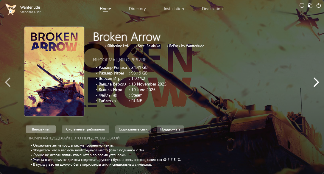 Год выпуска: 2025 Жанр: Strategy Разработчик: Steel Balalaika Издатель: Slitherine Ltd. Платформа: PC Тип издания: Repack Версия: 1.0.11.2 | от 18 ноября 2025 г. Язык интерфейса: Русский, английский, французский, итальянский, немецкий, испанский, японский, корейский, польский, португальский (бразильский), китайский (упрощенный), турецкий, украинский Язык озвучки: Английский Лекарство: Вшито (RUNE) Минимальные системные требования: > Операционная система: Windows 10 64-бит > Процессор: Core i7-6700 / Ryzen 3 2200G > Оперативная память: 8 ГБ > Видеокарта: 4 ГБ, GeForce GTX 1650 / Radeon RX 570 > Место на диске: 93.19 ГБ Описание: Broken Arrow — это масштабная военная тактическая игра реальном времени, где сочетается комплексный подход варгеймов, в которых используются разные рода войск, с динамичным, тактическим игровым процессом. В игре насчитывается более 300 реалистичных военных подразделений и технологий, а каждая битва дает полное погружение в процесс и имеет бесконечное множество вариантов прохождения. Особенности игры: Командуйте современными военными действиями с размахом Broken Arrow — это масштабная военная тактическая игра реальном времени, где сочетается комплексный подход варгеймов, в которых используются разные рода войск, с динамичным, тактическим игровым процессом. В игре насчитывается более 300 реалистичных военных подразделений и технологий, а каждая битва дает полное погружение в процесс и имеет бесконечное множество вариантов прохождения. Кинематографичная одиночная кампания Погрузитесь в захватывающую кампанию с продуманной историей, в которой представлены 19 тщательно проработанных миссий, действия которых происходят в Балтике. У вас есть возможность играть как за Соединенные Штаты, так и за Россию. В кампании представлен интригующий сюжет о нарастающем напряжении на мировой арене. Каждая миссия предлагает новые тактические испытания и сюжетные повороты. Будь то оборона ключевых позиций с элитными подразделениями или проведение смелых наступательных операций с общевойсковыми боями, каждая миссия — это испытание ваших навыков командира в динамичных и реалистичных военных сценариях. Захватывающие режимы игры Помимо одиночной кампании, вы сможете сразиться с ИИ в режиме Схватки на 19 картах, основанных на настоящих локациях, выбрав специализации и уровни сложности на свой вкус. После выхода игры в режиме «Схватка» будут доступны следующие варианты боев против ИИ: 3 на 3, 4 на 4 и 5 на 5. Объединяйтесь с друзьями и знакомьтесь с игрой в комфортном вам темпе, сражаясь против разнообразных команд под управлением ИИ, которые представят вам боевые группы, с которыми вам предстоит столкнуться на поле боя. В будущих обновлениях планируется доработать баланс для боев 1 на 1 и других вариантов одиночной игры как против ИИ, так и в кооперативе с ним. Но если вам больше нравятся живые противники, заходите в онлайн-игру и принимайте участие в захватывающих многопользовательских матчах 5 на 5. Следите за своим прогрессом и поднимайтесь в списке лидеров. Также, когда ваш уровень как генерала повышается, вы получаете опыт и новые медали. Дайте волю вашей креативности с помощью мощного редактора сценариев — того же инструмента, который использовался для создания миссий оригинальной игры. Создавайте собственные сценарии с катсценами и диалогами с помощью визуального редактора, для которого не нужно зна