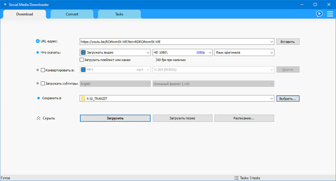 * Быстрая загрузка видео файлов в высоком качестве * Преобразование в популярные форматы * Вытягивания звуковых дорожек из видео файлов * Простой и понятный интерфейс