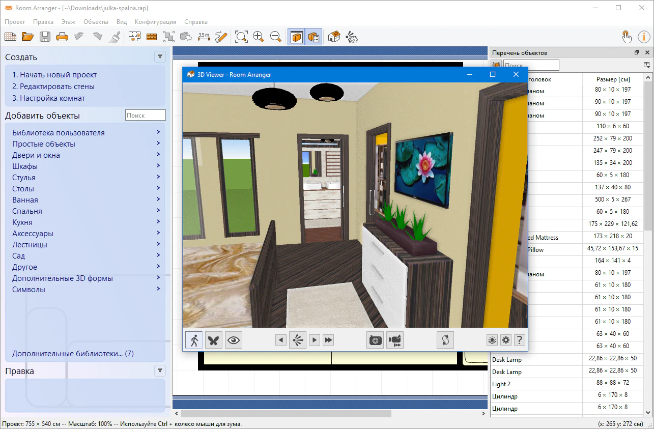 С Room Arranger можно создавать и редактировать любые элементы интерьера, двигать их, вращать, изменять цвет и размеры. В программе имеется богатейшая библиотека предметов интерьера, более того вы сможете воспользоваться дополнительной бесплатной библиотекой картинок предметов, посетив официальный сайт программы.