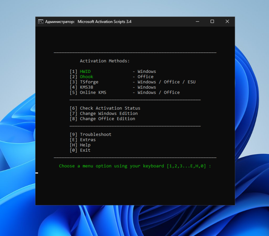 - Активация Windows (HWID) и Office (OHook) через MAS.