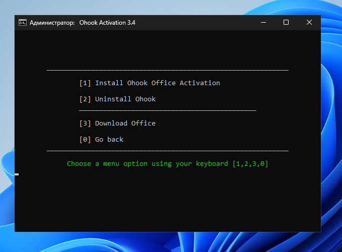 Далее если нужно активировать windows, нажмите на клавиатуре цифру "1", для активации office - цифру "2"