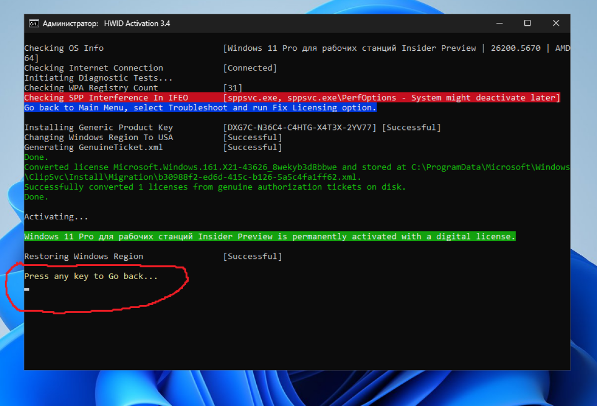Эскиз-В случае активации windows, дождитесь появления желтой строчки, которая означает успешную активацию