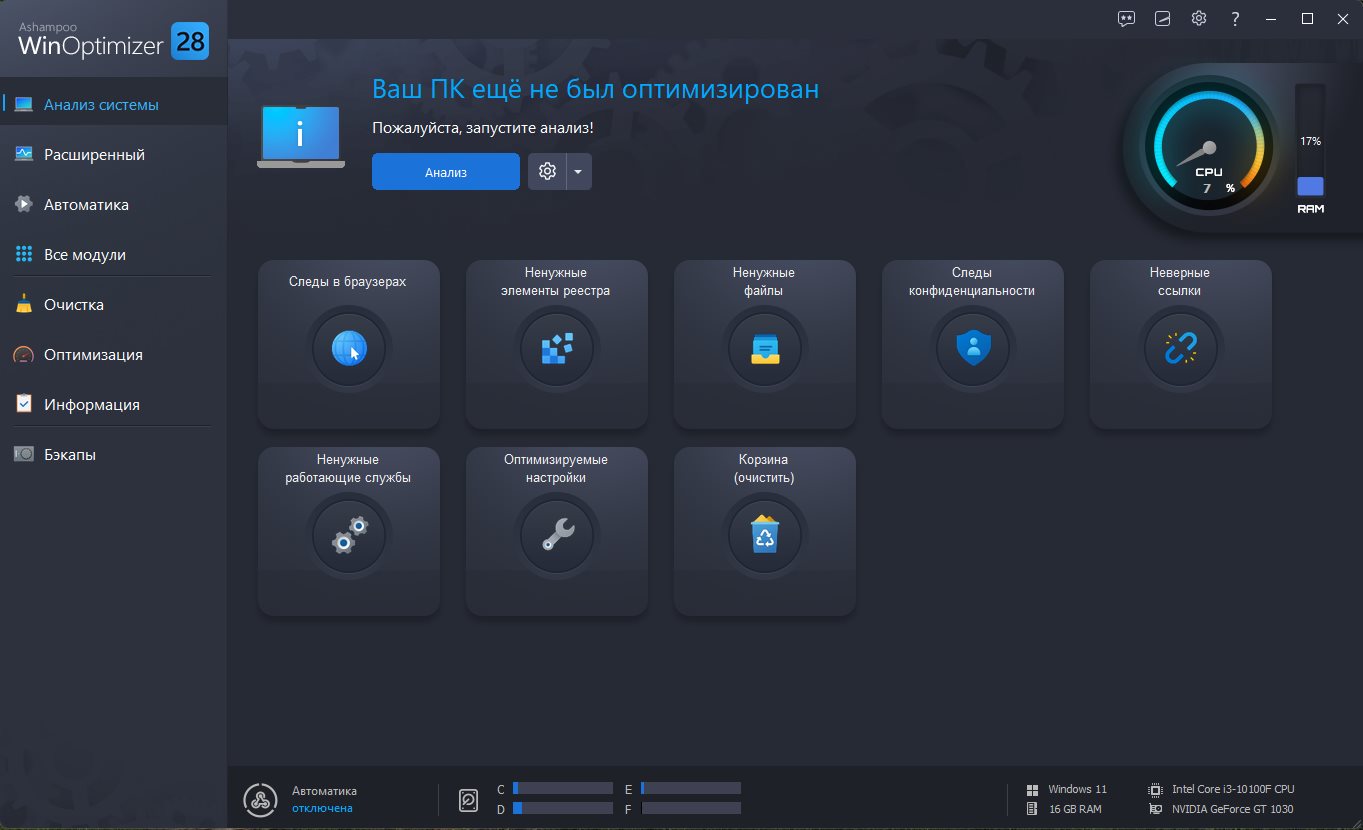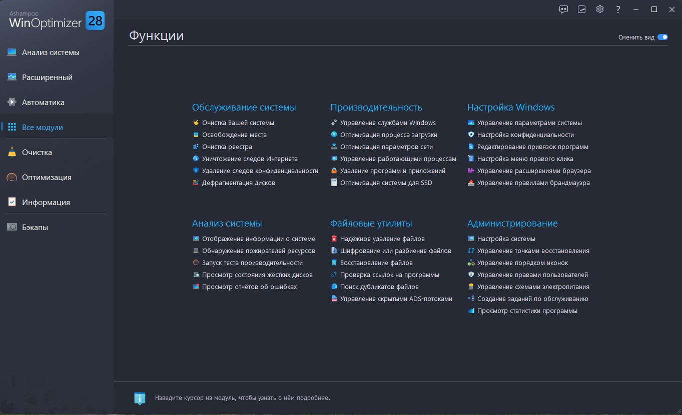 Версия: 28.00.12 Адрес оф. сайта: ashampoo Автор сборки: by elchupacabra Язык интерфейса: Русский, Английский Лечение: не требуется (инсталлятор уже пролечен) Системные требования: Операционная система: Windows® 7, 10, 11 (x86/x64) Компьютер: Любое устройство, поддерживающее перечисленные выше операционные системы. Системы с процессорами ARM не поддерживаются. Прочее: Разрешение экрана 1280x768 (Рекомендуемые: 1920x1080 ) Для использования программы требуются полные права администратора. - Описание: Ashampoo WinOptimizer - новая линейка пакета программ, позволяющего оптимизировать операционную систему благодаря ее настройке и очистке. Содержит утилиты для очистки жесткого диска и системного реестра, модуль для защиты личной информации путем поиска и удаления файлов и данных, оставшихся после интернет-cepфингa, утилиту для оптимизации интернет-соединения, модуль для настройки программ, загружаемых при запуске системы, а также модули для поиска и удаления ненужных файлов DLL, для безвозвратного удаления данных и для шифрования файлов. Кроме этого программа позволяет переназначать ассоциации файлов, шифровать и расшифровывать файлы. Наконец, предусмотрена настройка параметров системы и ее оптимизация за один клик. Дополнительная информация:Совершенно новые модули очистки. Усиленные и более эффективныеМодули очистки в Ashampoo WinOptimizer быстрее на 50% и ещё эффективнее, чем в предыдущей версии благодаря значительным техническим улучшениям. Между двумя версиями WinOptimizer ещё никогда не было такой значительной разными! Не важно, очистка диска или удаление следов работы в Интернете, результаты появляются практически мгновенно, а уровень обнаружения зашкаливает. Старые системы особенно выиграют от улучшения производительности, плавности анимаций, сниженного потребления памяти и новых контекстных меню. Естественно, все модули были тщательно настроены для работы с текущей версии операционной системы, средствами установки и браузерами. Новый уровень чистоты Благодаря новой расширенной углублённой очистке охота на хлам выходит на новый уровень. Различные проблемы, в том числе конфиденциальности, теперь легко устранимы! Избавьтесь от старых версий Windows, резервных копий обновлений и статистики использования Windows. Исправьте проблемы с графикой в Ваших играх, очистив кэш шейдеров DirectX. Ускорьте работу Проводника Windows удалив кэш миниатюр. Вы ещё при этом освободите кучу места на жёстком диске. Воспользуйтесь восемью новыми мощными возможностями и дайте Вашему ПК с Windows мощный прирост производительности! Меньше значит больше! Мы переработали интерфейс модулей очистки, чтобы предоставлять Вам ещё больше важной информации. Сворачиваемые категории содержат дополнительную информацию, доступную при необходимости. А контекстные меню предоставляют дополнительные возможности. А ещё есть поиск, который охватывает все категории. Более того, выполняемые задачи могут быть прерваны в любой момент. WinOptimizer – это первая версия, полностью полагающаяся на возможности многоядерных процессоров при работе модулей очистки (например, Registry Cleaner) для ещё большей скорости. Вы сразу заметите разницу! Универсальный менеджер cookie Несмотря на всю свою полезность и добавляемое удобство, файлы cookie недавно стали своего рода кошмаром конфиденциальности. Наш новый менеджер файлов cookie поможет Вам безопасно у
