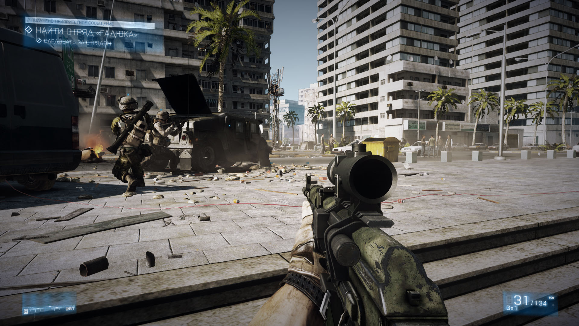 Battlefield 3 - оставляет позади всех своих конкурентов, благодаря мощностям нового невероятного игрового движка Frostbite™ 2 от DICE. На этом произведении искусства основывается весь Battlefield 3, предлагая игроку великолепное качество графики, локации невероятных масштабов, полное разрушение объектов, динамический звук и реалистичную анимацию персонажей. Вы сможете прочувствовать поле боя как никогда раньше, с свистящими вокруг пулями, рушащимися стенами и сбивающими вас с ног взрывами. В Battlefield 3 игрокам предстоит стать элитой морской пехоты США и погрузиться в захватывающие задания из одиночной игры и великолепные многопользовательские сражения по всему миру, в том числе в Париже, Тегеране и Нью-Йорке.