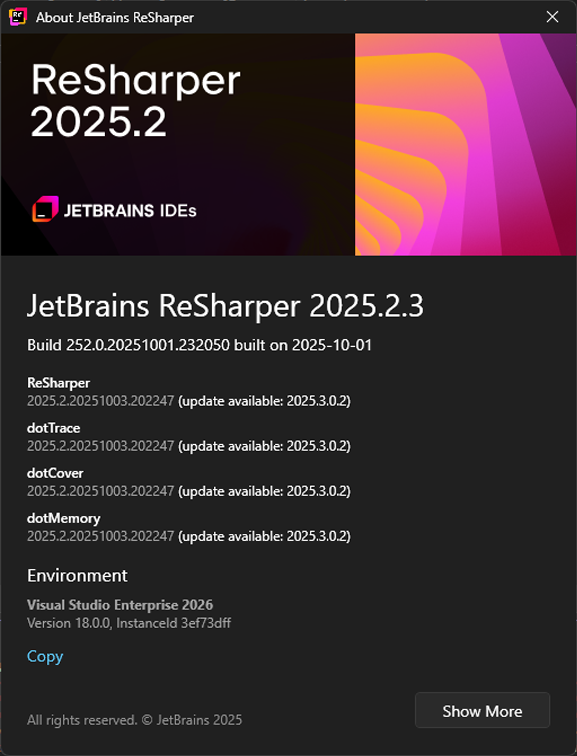 JetBrains dotUltimate 2025.2.3 [En]-Версия программы: 2025.2.3 Официальный сайт:ссылка Язык интерфейса: английский Лечение:в комплекте Тип лекарства: патч-кейген-Системные требования: ОС Windows 10 и старше, Windows Server 2019 и старше Visual Studio 2017, 2019, 2022, 2026 .NET Framework 4.7.2 или более поздняя версия Процессор: 2 GHz Память:16 GB-Описание: Полный набор инструментов для .NET Каким бы видом разработки вы ни занимались, dotUltimate сделает ее максимально эффективной. Он включает в себя расширения для Visual Studio, независимую IDE, а также набор инструментов для профилирования и анализа покрытия кода, которые помогут вам раскрыть весь потенциал платформы .NET. Разработка .NET охватывает самые различные области, такие как корпоративная разработка с использованием .NET Framework, кросс-платформенная разработка с применением .NET Core, мобильные приложения на Xamarin, игры на Unity, облачные приложения для AWS или Azure, а также веб-приложения на Blazor, Razor и ASP.NET / ASP.Net Core. Какой бы продукт вы ни разрабатывали, dotUltimate поможет решить ваши задачи.-