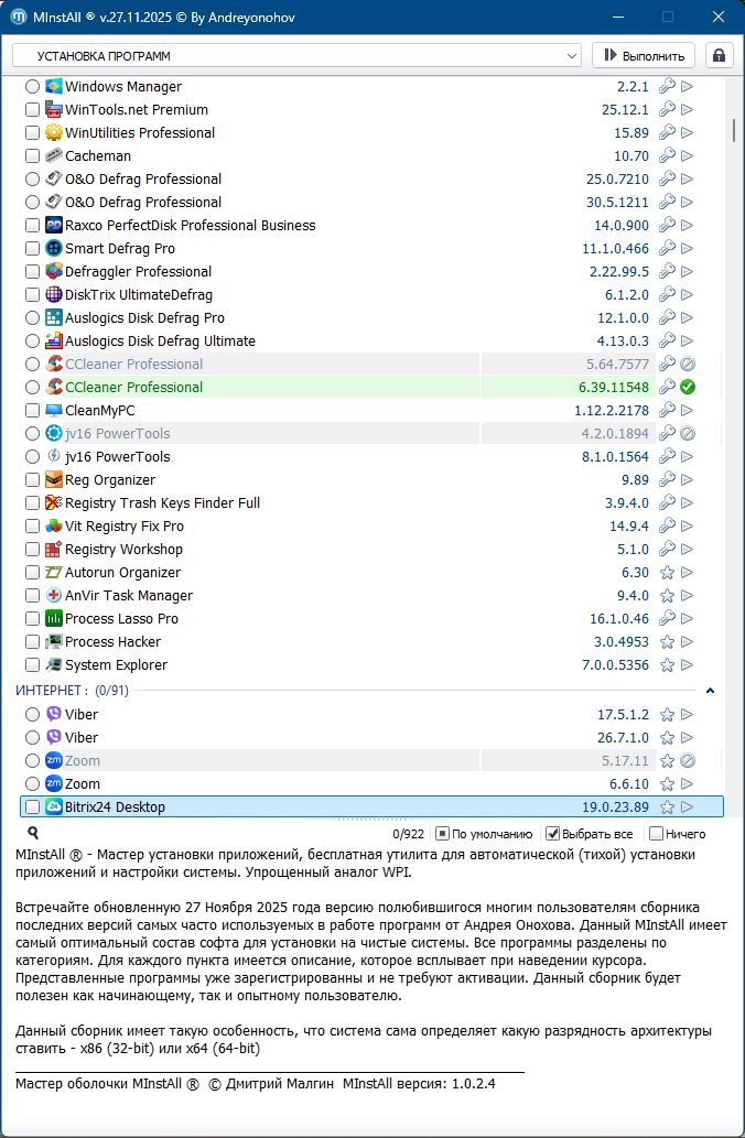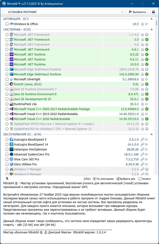 Версия программы: v.27.11.2025 Официальный сайт: MInstAll By Andreyonohov Язык интерфейса: Русский Лечение: не требуется (инсталлятор уже пролечен)- - Перед Вами обновленный 21 Сентября 2025 года полюбившийся многим пользователям сборник последних версий самых часто используемых в работе программ от Андрея Онохова. Теперь в новой, более простой и удобной оболочке MInstAll - это новый мастер установки приложений, упрощенный аналог WPI. Данный MInstAll имеет самый оптимальный состав софта для установки на чистые системы. Представленные программы уже зарегистрированы и не требуют активации.- ВАЖНО:• Ко многим программам применены "лекарства".• Поэтому во избежании ложных срабатываний антивирусов рекомендуется их отключить или добавить исключения. Особенности:• Все программы разделены по категориям.• Для каждого пункта имеется описание, которое появляется внизу окна при наведении курсора. • Данный сборник будет полезен как начинающему, так и опытному пользователю. • Данный сборник имеет такую особенность, что система сама определяет какую разрядность архитектуры ставить - x86 (32-bit) или x64 (64-bit). • Обо всех изменениях по сравнению с предыдущей версией читайте ниже. Список программ x86/x64 от 27.11.2025:• АКТИВАЦИЯ:Windows & Office 10.5 KMS Tools Lite Portable 24_10_2025 KMS Tools Portable 08_03_2025 -KMSoffline v2.4.7 RU EN -Activation Program v1.07/v1.14/v1.15 Portable -AAct v4.3.2 Portable -AAct Network v1.4.3 Portable -KMSAuto Lite Portable v1.9.9.9 b06 -W10 Digital Activation Program Portable v1.5.5.4/v1.5.5.5 -Office Installer+ v1.25/v1.31/v1.33 -Defender Tools v1.15 b10 -MSAct++ v2.09/v2.10 -PIDKey Lite v1.64.4 b46/b52 RU EN and more -Office 2013-2024 C2R Install++ v7.7.7.7 r25/r27 -Office Uninstall v2.0.2 -KMSAuto Net 2016 v1.5.4 Portable -KMSCleaner v2.5.1 Portable -ClearTemp v1.60 Portable -ConsoleAct v3.4 Portable -MSActBackUp Portable v1.2.8 -Garbage Collector v1.3.8 x86_x64_31_10_2020 =============================================== KMSAuto++ Portable v1.8.7/v1.9.9 b06 Microsoft Activation Scripts (MAS) 3.9 Windows Loader v.2.2.2 • СИСТЕМНЫЕ: Microsoft .NET Framework 1.1-4.0 (x86) - (XP) Microsoft .NET Framework 3.5 (x86/x64) (22.04.2019) - (8.1-11) Microsoft .NET Framework 4.8 (x86/x64) (01.05.2021) - (7-10) Microsoft .NET Framework 4.8.1 (x86/x64) - ((10/11)) Microsoft .NET Runtime 8.0.22/9.0.11/10.0 (x86/x64) - (7-11) Microsoft Edge WebView2 Runtime 109.0.1518.78 (x86/x64) - (7-8.1) Microsoft Edge WebView2 Runtime 142.0.3595.94 (x86/x64) - (10/11) Microsoft Silverlight 5.1.50918.0 (x86/x64) DirectX (июнь 2010) (x86/x64) Java SE Runtime Environment 7.0 Update 80 (x86/x64) - (XP-8.1) Java SE Runtime Environment 8.0 Update 471 (x86/x64) - (7-11) Java SE Development Kit 25.0.1 (x64) - (7-11) RuntimePack Lite 20.3.3 (x86/x64) Microsoft Visual C++ 2005-2008-2010-2012-2019 Redistributable Package (x86/x64) (09.04.2022) - (XP-11) Microsoft Visual C++ 2015-2022 Redistributable (x86/x64) - 14.44.35211.0 - (7-11) Microsoft Visual C++ 2026 Redistributable (x86/x64) - 14.50.35719.0 - (8.1-11) UpdatePack-XPSP3-Rus Live + Internet Explorer 8 + wmp11 19.11.15 (x86) - (XP) UpdatePack7R2 for Windows 7 SP1 + Internet Explorer 11 22.2.10 (x86/x64) - ![]() • ОБСЛУЖИВАНИЕ ОС: AusLogics BoostSpeed 5.5.1.0 (06.05.2019) - (XP-8.1) Auslogics BoostSpeed 14.1.0.0 - (7-11) Ashampoo WinOptimizer 28.00.20 - (7-11) Advanced SystemCare Pro 19.0.1.160 Wise Care 365 Pro 7.3.2.716 Glary Utilities Pro 6.34.0.38 Windows 7 Manager 5.2.0 - ![]() Windows 8 Manager 2.2.8 - (8.1) Windows Manager 2.2.1 - (10/11) WinTools.net Premium 25.12.1 WinUtilities Professional 15.89 Cacheman 10.70.0.4 O&O Defrag Professional 25.0.7210 (x86/x64) - (7-11) O&O Defrag Professional 30.5.1211 (x64) - (8.1-11) Raxco PerfectDisk Professional Business 14.0.900 Smart Defrag Pro 11.1.0.466 Defraggler Professional 2.22.99.5 (03.05.2019) DiskTrix UltimateDefrag 6.1.2.0 Auslogics Disk Defrag Pro 12.1.0.0 Auslogics Disk Defrag Ultimate 4.13.0.3 CCleaner Professional 5 64.7577 - (XP/Vista) CCleaner Professional 6.39.11548 - (7-11) CleanMyPC 1.12.2.2178 jv16 PowerTools 4.2.0.1894 - (XP/Vista) jv16 PowerTools 8.1.0.1564 - (7-11) Reg Organizer 9.89 Registry Trash Keys Finder Full 3.9.4.0 (19.02.2018) Vit Registry Fix Pro 14.9.4 Registry Workshop 5.1.0 Autorun Organizer 6.30 AnVir Task Manager 9.4.0 Process Lasso Pro 16.1.0.46 Process Hacker 3.0.4953 (31.03.2023) System Explorer 7.0.0.5356 • ИНТЕРНЕТ: Viber 17.5.1.2 (x86/x64) - (7-10) Viber 26.7.1.0 (x64) - (10/11) Zoom 5.17.11.34827 (x86/x64) - (7/8.1) Zoom 6.6.10.22255 (x86/x64) - (10/11) Bitrix24 Desktop 19.0.23.89 Telegram Desktop 6.3.4 (x86/x64) MAX Desktop 25.17.0 (x64) - (10/11) Mozilla Thunderbird 115.18.0 (x86/x64) - (7/8.1) Mozilla Thunderbird 145.0 (x86/x64) - (10/11) eM Client Pro 7.2.40748.0 - (XP-11) eM Client Pro 10.3.2619.0 - (7-11) Mailbird 3.0.10.0 - (7-11) Mailbird 3.0.44.0 - (10/11) MailWasher Pro 7.15.45 The Bat! Professional 9.1.18 (x86/x64) - (XP/Vista) The Bat! Professional 10.4.0.1 (x86/x64) - (7/