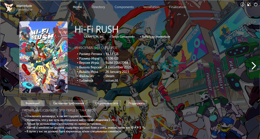 Год выпуска: 2023 Жанр: Action Разработчик: Tango Gameworks Издатель: KRAFTON, Inc. Платформа: PC Тип издания: Repack Версия: Build 20567064 | от 4 декабря 2025 г. Язык интерфейса: Русский, английский, французский, итальянский, немецкий, испанский, арабский, испанский (латиноамериканский), португальский (бразильский), польский, китайский (упрощенный), китайский (традиционный), японский, корейский Язык озвучки: Русский, английский, французский, итальянский, немецкий, испанский, испанский (латиноамериканский), португальский (бразильский), польский, японский Лекарство: Вшито (voices38) Минимальные системные требования: > Операционная система: Windows 10/11 64-бит > Процессор: Core i5-6500 / Ryzen 3 1200 > Оперативная память: 8 ГБ > Видеокарта: GeForce GTX 1050 / Radeon RX 560, DirectX 12 > Место на диске: 17 ГБ Описание: Поймайте ритм вместе с начинающей рок-звездой Чаем и его командой, чтобы бросить вызов злобной мегакорпорации! Hi-Fi RUSH — это новый боевик от Tango Gameworks, авторов The Evil Within® и Ghostwire®: Tokyo (без шуток), в котором всем заправляет музыка! Особенности игры: Чай Против Всех Во время незаконного эксперимента в корпорации к сердцу Чая по ошибке припаяли плеер, и поэтому паренёк был признан бракованным образцом. Теперь ему предстоит сразиться за свободу в красочном анимированном мире, где всё подчиняется музыкальному ритму — головоломки, враги, даже приколы и перепалки! Устроим Слэм! Дайте отпор полчищам роботов и двигайтесь в такт музыке, чтобы наносить удары в бит, выполнять эффектные приёмы и проводить совместные атаки с напарниками! Хотите похвастаться мастерством? Не сбивайтесь с ритма, чтобы заработать как можно больше очков. Бунтари Против Боссов Соберите отряд колоритных союзников и проникните в самое сердце бездушной корпорации, где встречи с вами ждут начальники всех отделов — от производства до рекламы и финансов. Каждый из них готов защищать доходы компании до последнего, так что приготовьтесь к сумасшедшим битвам под уникальный саундтрек! Не Забудьте Наушники Вас ждут потрясающие оригинальные треки, а также песни от Nine Inch Nails, The Prodigy, The Joy Formidable и многих других групп. Хотите продемонстрировать свои навыки в Hi-Fi RUSH всему миру? На помощь придёт режим трансляции, в котором музыка, защищённая авторскими правами, будет заменена на оригинальные композиции, созданные для трансляций игры Hi-Fi RUSH. Особенности RePack'аОсобенности RePack'a:- Репак основан на файлах игры из Steam (thx voices38) - Ничего не вырезано / Ничего не перекодировано - Присутствует русская озвучка от R.G.MVO [v.1.03 от 03.01.2025] - Установка занимает ~10 минут [9700X/32GB/SSD] - Инсталлятор поддерживает только Windows 10/11! - Сменить язык можно в настройках игры! Дополнительный контент: » Hi-Fi RUSH: Deluxe Edition Upgrade Pack » Hi-Fi RUSH: Bossplay Costume Pack » Hi-Fi RUSH: Teamplay Costume Pack » Hi-Fi RUSH: Traditional Garb Costume Pack Repack от Wanterlude Решение проблем с репакамиЕсли при установке моих или любых других репаков у вас возникают ошибки, попробуйте следующие действия:• Перехешируйте торрент! - например в uTorrent нужно выбрать игру, нажать стоп, нажать правую кнопку мыши и выбрать "Форсировать проверку" (Force re-check). • Убедитесь, что в вашем имени пользователя в Windows нет русских или других нелатинских букв - допустимы только латинские буквы и цифры • Отключите антивирус - он может ложно срабатывать на лекарства, чем либо прервет установку репака, либо просто не даст запустить игру • Отключите UAC - он может блокировать программы распаковки/сборки 