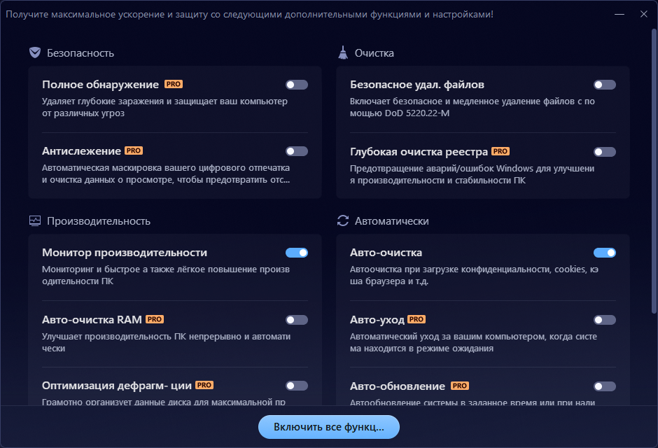 Advanced SystemCare 19 Pro — это комплексный пакет программ для оптимизации и защиты ПК от IObit. На самом деле, в Advanced SystemCare 19 Pro есть не одна функция оптимизации. Более того, перечислить их все просто невозможно. Поэтому я рассмотрю функции по категориям, таким как «Оптимизация», «Очистка» и «Утилиты». Основные преимущества: - Увеличение производительности ПК до 200% - Увеличение скорости интернета до 300% - Глубокая очистка мусора и реестра для освобождения дискового пространства - Автоматическая защита конфиденциальности и защита от отслеживания - Сканирование и исправление наиболее распространенных проблем с помощью искусственного интеллекта в один клик - Работает как на старых, так и на новых ПК Основные функции : • Ускорение Turbo Boost — останавливает ненужные службы и освобождает оперативную память Startup Optimizer — управляет элементами автозагрузки, службами, запланированными задачами и плагинами браузера Hardware Accelerator — обновляет драйверы (на базе ограниченной версии IObit Driver Booster) Real-time TuneUp & AutoCare — автоматическая фоновая оптимизация Дополнительные функции PRO: Smart RAM, Internet Booster, Registry Cleaner • Защита Защита системы: антивирус, брандмауэр, антишпион (PRO) Защита браузера: удаление рекламы, защита при просмотре веб-страниц, советник по домашней странице, защита электронной почты Защита конфиденциальности: защита от отслеживания, защита от отпечатков пальцев, безопасная папка (новая функция зашифрованной папки с защитой паролем) – все только в версии PRO. • Уход (основное сканирование) Режим AI: интеллектуальное сканирование и исправление в один клик. Ручной режим: выбор конкретных модулей (очистка конфиденциальности, ненужные файлы, очистка реестра, исправление ярлыков, ускорение интернета, оптимизация диска, исправление уязвимостей и т. д.). Включает в себя состояние программного обеспечения (устаревшие программы) и состояние оборудования (драйверы) • Обновление программного обеспечения Автоматически обнаруживает и обновляет устаревшие приложения одним щелчком мыши. • Набор инструментов Более 30 дополнительных утилит (очистка диска, очистка реестра, Smart RAM, Win Fix и т. д.) Большинство инструментов можно загрузить по запросу; некоторые из них являются бесплатными версиями других продуктов IObit (Driver Booster, Uninstaller, Malware Fighter, Smart Defrag). • Пользовательский интерфейс и опыт Чистый дизайн с несколькими вкладками (Ускорение, Защита, Уход, Обновление программного обеспечения, Набор инструментов) Панель быстрых настроек для мгновенного переключения ключевых функций Скорость сканирования немного ниже, чем в предыдущих версиях, но более тщательная Сканирование не прерывает работу других программ • Совместимость Хорошо работает с большинством антивирусных программ (протестировано с Bitdefender, Avira, McAfee, Vipre). Известен конфликт с Malwarebytes (обнаруживает ASC как PUP — ложное срабатывание). Короче говоря, Advanced SystemCare 19 Pro предлагает комплексный, простой в использовании пакет инструментов для оптимизации, очистки и обеспечения конфиденциальности, с множеством расширенных функций, доступных только в платной версии Pro.
