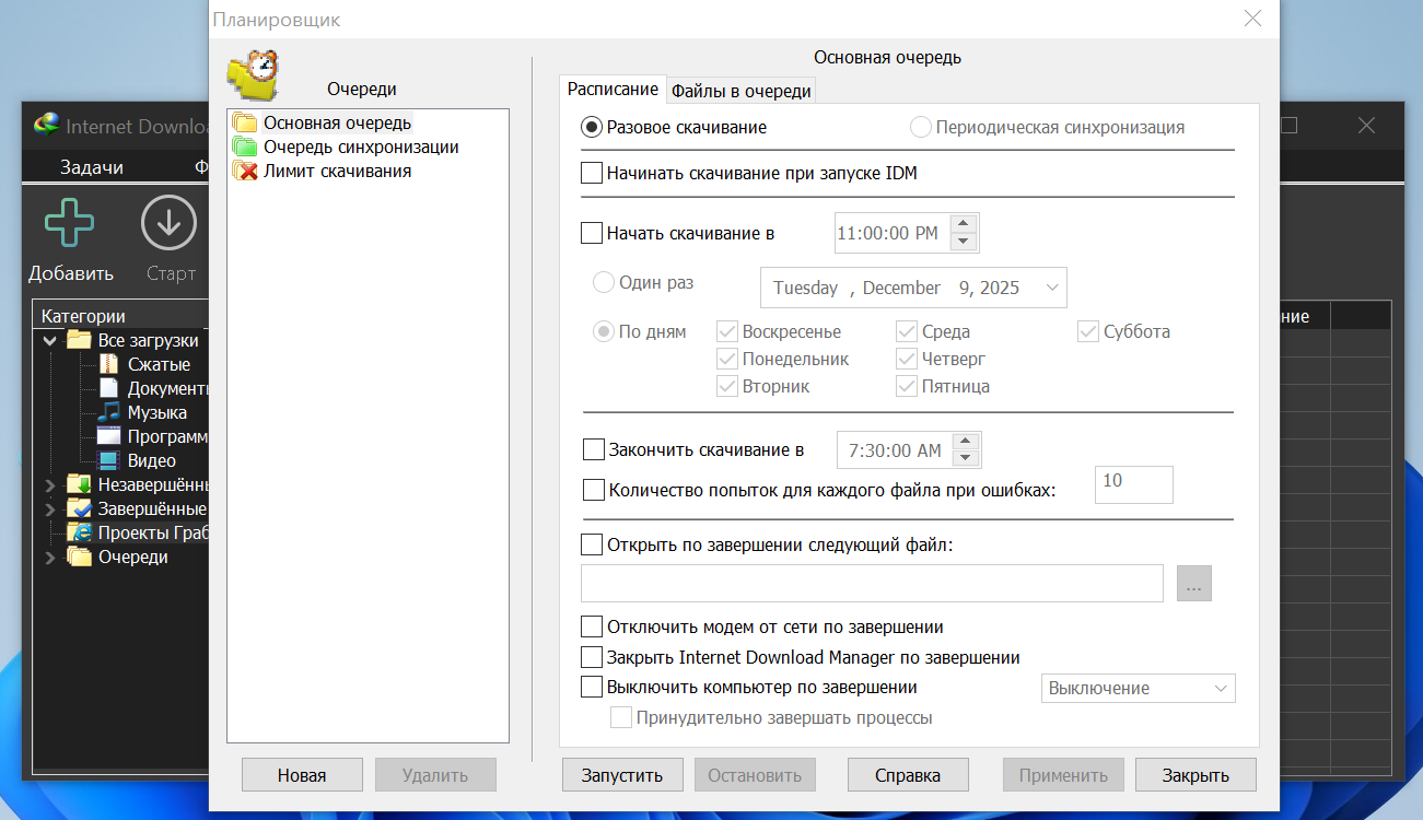Совместимость со всеми браузерами и протоколами Internet Download Manager работает с самыми популярными браузерами, включая Google Chrome, Mozilla Firefox, Microsoft Edge, Opera и многими другими. Как только программа обнаруживает ссылку на загрузку (независимо от типа файла), появляется всплывающее окно, в котором можно выбрать, хотите ли вы начать загрузку через Internet Download Manager. Поддерживаются протоколы HTTP, HTTPS, FTP и MMS, что позволяет скачивать файлы практически с любого сайта или сервера без проблем с совместимостью. Это касается как стриминговых платформ, так и частных FTP-серверов или страниц с ограничениями на подключение. Скачивайте видео со стриминговых сайтов в один клик С помощью Internet Download Manager можно скачивать видео напрямую с таких сайтов, как YouTube, Vimeo, Dailymotion и других стриминговых сервисов. Когда программа обнаруживает видео на поддерживаемом сайте, в правом верхнем углу появляется кнопка, с помощью которой можно загрузить видео в разном качестве, включая HD и Full HD. Чтобы использовать эту и другие функции, например автоматическую загрузку, необходимо включить расширение IDM в браузере. Гибкое планирование и автоматизация Internet Download Manager позволяет настроить запуск загрузок по расписанию в указанное время. Это удобно, если вы, например, оставляете компьютер включенным на ночь или предпочитаете загружать файлы, когда не используете интернет для других задач. Все загрузки ставятся в очередь, и в назначенное время процесс начинается автоматически. Также можно настроить автоматическое выключение компьютера после завершения всех загрузок. Дополнительно можно задать правила, чтобы файлы определенного типа сохранялись в нужные папки — это помогает лучше организовать все загрузки. Восстановление прерванной загрузки Еще одна полезная функция Internet Download Manager — возможность продолжить прерванную загрузку. Если у вас пропадет интернет, произойдет отключение от сервера или вы случайно выключите компьютер, вы сможете возобновить загрузку с того места, где она остановилась, без необходимости начинать всё сначала. Это особенно удобно при загрузке больших файлов или с серверов, ограничивающих скорость, поскольку позволяет не терять уже загруженные данные. Автоматическая сортировка файлов и фильтры Internet Download Manager позволяет создавать собственные фильтры и автоматически сортировать загрузки по категориям в зависимости от типа файлов. Например, видеофайлы можно сохранять в одну папку, а PDF или ZIP — в другую. Интеграция с антивирусом и автоматическое сканирование Для защиты компьютера вы можете настроить Internet Download Manager так, чтобы после завершения каждой загрузки автоматически запускалась проверка антивирусом по вашему выбору. Это помогает убедиться, что загруженные файлы не содержат угроз до того, как вы их откроете.
