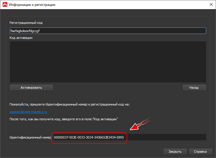 ЭскизВести регистрационный код и скопировать Идентификационный номер: