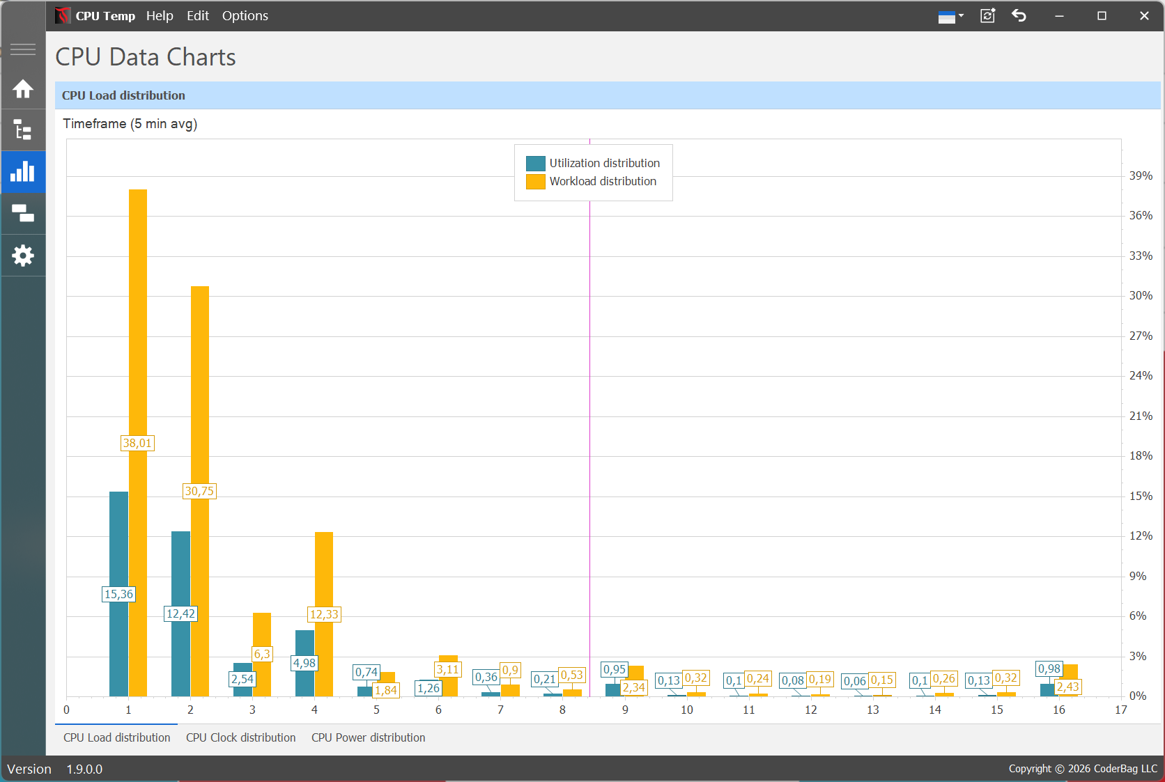 Каждый элемент управления графиком показывает средние данные распределения для каждого ядра процессора за настраиваемое окно временного интервала, которое по умолчанию установлено на 5 минут (или меньше, если приложение работает менее 5 минут).