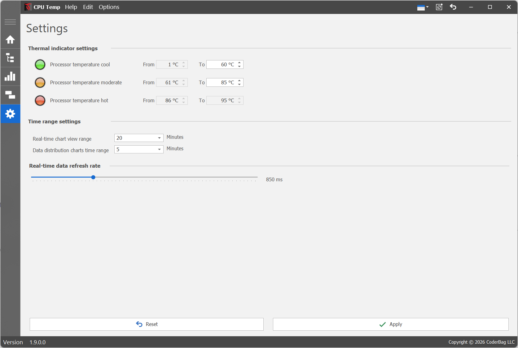 Тепловой индикатор использует трехцветную схему для визуального отображения текущего диапазона температур, при которых работает процессор. Для настройки пороговых значений температуры пользователи могут перейти в меню "Настройки", расположенное на левой навигационной панели.