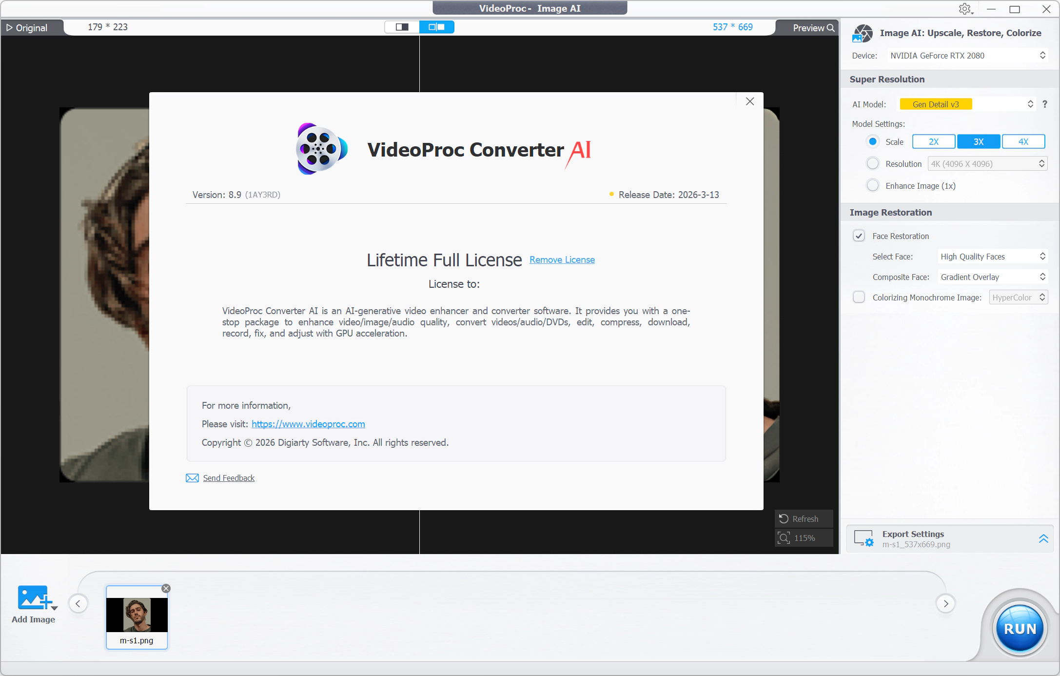 Благодаря технологии 3x-уровневого аппаратного ускорения Level-3 он максимально эффективно использует GPU; Intel QSV, NVIDIA CUDA/NVENC и AMD для сверхбыстрого кодирования и декодирования видео, чем 64 раза быстрее ускоряет обработку видео! https://www.videoproc.com/video-converting-software...n/tech-specs.htmVideoProc Converter AI – Конвертация:Конвертация видео Специализированный видеоконвертер для транскодирования, ремикширования без транскодирования (автоматическое копирование), сжатия медиафайлов, смены контейнера и управления настройками кодеков. Конвертация более 370 входных форматов в более 420 выходных форматов Видео в видео, видео в аудио, аудио в аудио Поддержка новых кодеков, таких как AV1, ProRes, HEVC и VP9 Преобразование 3D-стереоскопического видео в 2D; преобразование 360-градусного и VR-видео Преобразование видео в GIF, преобразование GIF в видео Настройки кодеков: 2-проходное кодирование, GOP, настройки B-кадров, редактор тегов/метаданных Создание MKV Автоматическое копирование (ремультиплексирование) Специальный компрессор для простого (пакетного) сжатия видео без потери качества Пакетные задачи для экономии времени Конвертация аудио Встроенный специализированный аудио-конвертер Входные форматы: A52, AAC, AC3, AIF, AIFF, AMR, ANX, AOB, APE, AQT, ASX, AXA, DTS, FLAC, M2A, M4A, MKA, MLP, MOD, MP1, MP2, MP3, MPA, MPC, OGA, OGG, OMA, RA, RAM, SPX, TTA, VOC, VQF, WAV, WMA, WV, XA, XM и др. Выходные форматы: MP3, M4A, WAV, FLAC, AAC, OGG, AC3, AIFF, CAF, M4R DVD Копирование и клонирование DVD; создание образа ISO Резервное копирование DVD: основная копия, копия раздела, ISO, VIDEO_TS Конвертация DVD в MKV, MP4, MOV, WebM и др.VideoProc Converter AI – Инструменты искусственного интеллекта:[Видео] Супер-разрешение «Gen Detail» V3 — новая модель для генерации мелких деталей: кожи, ткани и естественных текстур с четкостью на уровне Retina Увеличивайте разрешение старых, зернистых видео, DVD и записей с низким разрешением на 400 % до HD/4K Получите естественный результат без артефактов сжатия/декодирования, пикселизации или блокировки Возродите аниме, игры, видео с GoPro и дронов, DVD, рипы с VHS/DV, документальные фильмы о дикой природе и старые видеозаписи [Видео] Интерполяция кадров Преобразуйте видео с низкой частотой кадров в видео с высокой частотой кадров с помощью кадров, сгенерированных искусственным интеллектом Объедините видео с частотой 24/25/30 кадров в секунду в видео с частотой 60/120/240 кадров в секунду Интеллектуальное распознавание смены сцены для предотвращения эффекта «желе» и появления странных артефактов Идеально подходит для создания сверхплавного замедленного видео, обработки старых записей, ускоренных видео, анимации или повседневных записей [Видео] Стабилизация видео Легко исправьте дрожащее видео и получите четкое изображение Режим стабилизации и готовые настройки «Steady» для любых ситуаций Настройте сохранение краев с помощью опций динамического кадрирования Предварительный просмотр в реальном времени для точной и оперативной настройки [Изображение] Сверхвысокое разрешение Модель «Gen Detail» версии 3 для генерации сложных деталей: кожи, ткани и других элементов с четкостью уровня Retina. Обновлено Увеличение разрешения изображений/ИИ-искусства до 8K/10K с реалистичными деталями Восстановление, удаление шума, устранение артефактов сжатия JPEG, устранение размытости и повышение резкости изображений [Изображение] Восстановление лица VideoProc Converter AI: Восстановление лиц — новая функция Восстановление лиц с помощью искусственно