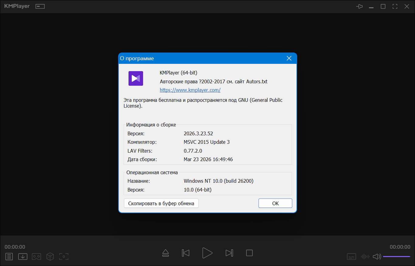 Версия программы: 2026.3.23.52 Официальный сайт: kmplayer.com Язык интерфейса: Русский, Английский, другие Лечение: не требуется-Системные требования: ОС: Windows 11 / 10 / 8.1 / 8 / 7 (64-bit) Жесткий диск: 300 Мб ОЗУ: 1 GB, для SVP 2GB ЦП: Intel Core2Duo и выше Видеокарта: DirectX 9.0 VRAM 256 MB Разрешение: 1024 x 768 и выше-Описание: The KMPlayer – это мощный мультимедиа проигрыватель, предназначенный для воспроизведения аудио/видеофайлов практически всех возможных форматов. Убедиться в этом и испытать его в работе очень просто - достаточно скачать KMPlayer и запустить, никакие дополнительные установки не нужны, тем более, что такие кодеки, как DVD, AVI, VCD, Ogg, MKV, mp3, OGM, 3GP, MPEG-1/2/4, WMV, RealMedia, FLV и QuickTime в KMPlayer уже встроены. Плеер наделён потрясающим дизайном, интуитивным интерфейсом, абсолютным разнообразием настроек и функций. Всё это позволяет создать индивидуальное внешнее оформление и настроить воспроизведение мультимедиа контента так, что это будет полностью соответствовать вашим личным предпочтениям. Вполне вероятно, что с KMPlayer ощущения от просмотра фильмов и прослушивания музыки станут гораздо ярче!-Основные возможности KMPlayer:Плейлист сохраняется при каждом выключении и включении медиаплеера Программа может автоматически регулировать громкость при воспроизведении «тихих» файлов Одна из важнейших особенностей KMPlayer – это проигрывание дефектных и не полностью загруженных файлов Функция сохранения точки воспроизводимого файла позволяет вернуться к просмотру видео с того фрагмента, на котором воспроизведение закончилось в предыдущий раз Вести запись воспроизводимого звука Запускать визуальное сопровождение аудио файлов Активировать обработку аудио. Данная функция позволяет исключить затишье между проигрываемыми треками, плавно переключая их Просматривать видеофайлы в формате 3D.Особенности Portable:Портативная версия от 7997, работает без инсталляции на ПК Не требует регистрации Язык интерфейса: Русский, Английский, другие Не оставляет следов в системе и реестре Для распаковки программы запустите "KMPlayer.exe". Файл запуска программы "KMPlayer64_Portable.exe". Добавляется в hosts и удаляется при завершении работы: 127.0.0.1 gplayer.kmpmedia.net 127.0.0.1 cdn.kmplayer.com -