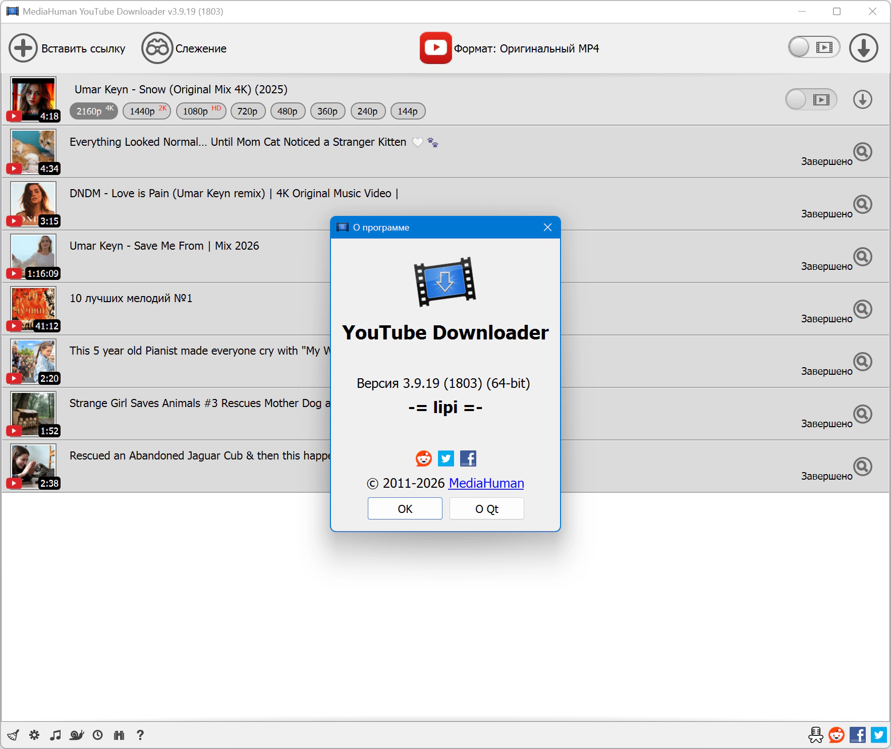Версия программы: 3.9.19 (1803) Официальный сайт: ссылка Язык интерфейса: Русский, Английский и другие Лечение: в комплекте Тип лекарства: добавление файлов-Системные требования: Windows 7 – 11 (64-bit)-Описание: На YouTube можно найти много интересного, но по умолчанию вы не можете скачать видео или сохранить его в виде аудиофайла. Именно поэтому мы разработали YouTube Video Downloader. Это приложение поможет вам загружать видео быстро и без заминок. С помощью нашей программы вы можете просто скачать сразу весь плейлист или канал YouTube и смотреть его когда угодно и где угодно.-Дополнительная информация:Закачка нескольких файлов одновременно Сохранение видео целиком, либо только звуковой дорожки Загрузка содержимого плейлистов и каналов YouTube, Rutube, Vimeo, Dailymotion и др. Автоматическая загрузка только новых видео из канала Поддержка iTunes/Music.app Скачивает в оригинальном качестве и конвертируетОсновные возможности:Слежение за буфером обмена Программа следит за содержимым буфера обмена и как только обнаруживает в нем поддерживаемую ссылку - автоматически добавляет видео в очередь для загрузки. Добавление в iTunes/Music.app В настройках программы можно выбрать опцию автоматического добавления скачанных роликов в библиотеку iTunes/Music.app. Также есть возможность указать плейлист, куда следует добавлять загрузки. HQ, HD, 4K или 8K Программа поддерживает загрузку всех доступных разрешений, но выбор остается за вами, будет это 720p, 1080p, 4K или 8K, 60 fps или 30. Плейлисты и каналы Программа поддерживает загрузку всех видео из плейлиста или канала. Также есть функция слежения за выбранным каналом или плейлистом с последующей загрузкой новых роликов. Качество оригинала Вы можете сохранять ролики в оригинальном качестве без преобразования. В этом случае загруженный ролик будет идентичен тому, который загрузил автор. Простой редактор тегов Приложение автоматически определяет исполнителя и название видео и сохраняет его в скачанный файл. Но в то же время, вы можете легко изменить их. Не только YouTube Программа также поддерживает Rutube, Vevo.com, Vimeo, Dailymotion, Facebook, ВКонтакте, OK.ru, Bitchute, Rumble, Odysee, Soundcloud и множество других сайтов. Так что вы можете скачивать видео с этих сервисов так же легко, как и с YouTube. Drag&drop Полная поддержка функции "drag&drop". Просто перетащите ссылку на видео с помощью мыши и бросьте ее на главное окно приложения или на значок в доке (для Mac). Авторизация Программа позволяет авторизоваться в браузере и сохранить куки, чтобы загружать закрытые плейлисты, видео с ограничением по возрасту и плейлист Смотреть позже. Так же поддерживается YouTube Music Premium, SoundCloud Go и т.д.Процедура лечения:Установить программу, отказаться от запуска. Если запустили — закрыть. Поместить в файл hosts следующие строки: 0.0.0.0 api.ipify.org 0.0.0.0 mh.mediahuman.net 0.0.0.0 www.mdhmn.com 0.0.0.0 www.mediahuman.com 0.0.0.0 www.mediahuman.net С помощью кегена создаём активационный код для набранного имени и активируем программу. Можно пользоваться.