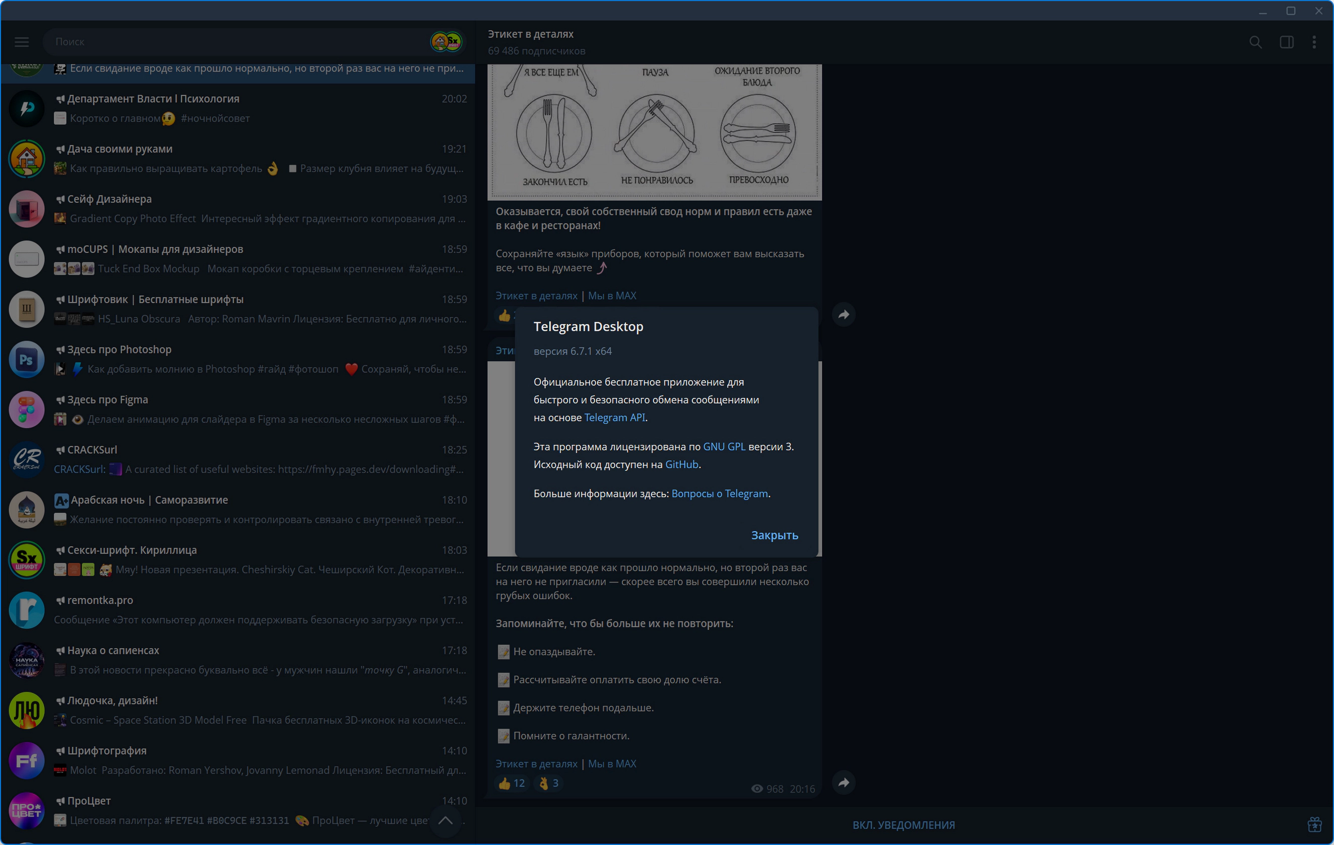 Telegram Desktop 6.7.2 + Portable [Multi/Ru]-Год выпуска: 2026 Версия: 6.7.2 Адрес оф. сайта: Telegram Язык интерфейса: Русский, Английский и другие Операционная система: Windows 7 – 11 (x86 / x64) Лекарство: не требуется-Описание: Telegram Messenger — простой и бесплатный кроссплатформенный мессенджер с акцентом на скорость и безопасность обмена сообщениями. Вы можете использовать приложение на всех ваших устройствах одновременно — все ваши сообщения будут автоматически синхронизироваться между вашими смартфонами, планшетами и компьютерами. С помощью Telegram вы можете отправлять сообщения, фотографии, видео и файлы любого типа (DOC, ZIP, MP3 и т.д.), а также создавать группы до 200 человек. Вы можете писать всем вашим телефонным контактам и находить людей по именам пользователей. Таким образом, Telegram Messenger объединяет возможности общения через SMS и электронную почту, позволяя быстро и безопасно обмениваться сообщениями между вашими личными или бизнес контактами.-Что вы можете с Telegram?• Связываться из самых отдаленных мест. • Координировать группы до 5000 человек. • Синхронизировать ваши чаты на всех ваших устройствах. • Отправлять документы любого типа. • Шифровать личные и коммерческие тайны. • Уничтожать ваши сообщения по таймеру. • Хранить ваши медиафайлы в облаке. • Создавать ваши собственные инструменты в нашем API. • Наслаждаться отзывами ваших клиентов.О Portable:• Портативная версия предоставлена разработчиком, работает без инсталляции на ПК. • Распространяется в виде авторского архива по причине высокой степени сжатия и наличия файлов нулевой длины.