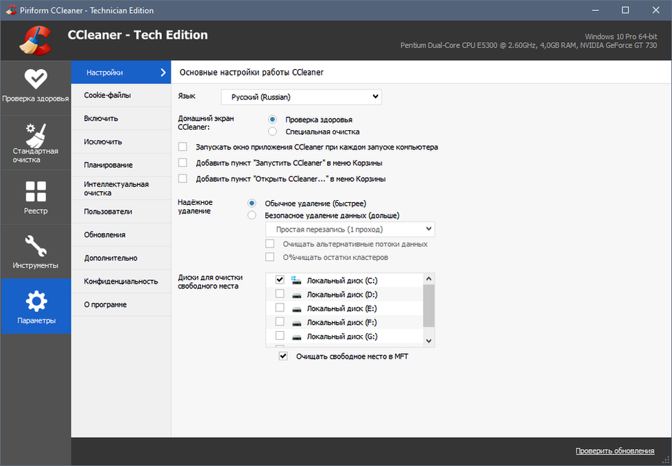Продвинутые опции позволяют чистить: