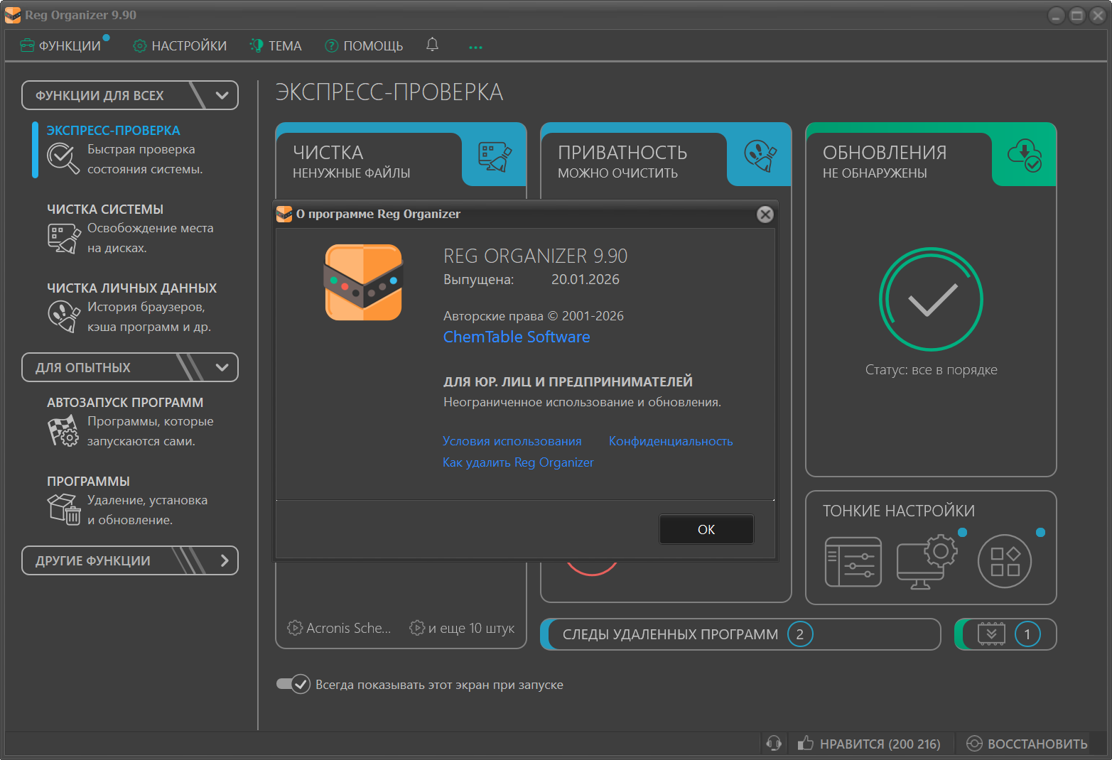 Reg Organizer 9.90 [Multi/Ru]-Версия программы: 9.90 Официальный сайт:ChemTable Язык интерфейса: Русский, Английский и другие Лечение:в комплекте Тип лекарства: патч-Системные требования: Windows 7 – 11 (x86/x64) Оперативная память: от 256 Мб Дисковое пространство: 50 Мб Права администратора-Описание: Reg Organizer® - это многофункциональная программа для комплексного обслуживания системного реестра операционных систем Microsoft Windows. Позволяет проводить чистку реестра, его сжатие и дефрагментацию. Имеет редактор системного реестра и расширенную функцию поиска и замены данных. С помощью утилиты Reg Organizer можно осуществлять предварительный просмотр импортируемых reg-файлов (в том числе и из Проводника). Кроме того, позволяет производить полное удаление программного обеспечения (основана на технологии Full Uninstall™), подчищая все "хвосты", которые остаются в системе при обычном удалении.-
